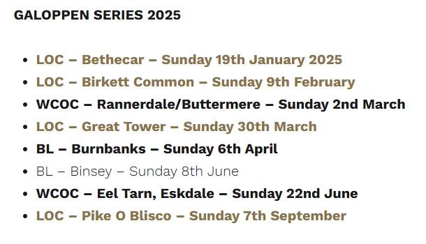 From 2025, following a suggestion from BL, Very Short Green (VSG) courses will be included in the Cumbrian Galoppen. This means that VSG will have the same status as all the other courses, with league tables compiled and series winners announced. Also, competitors on VSG will count towards the Borrowdale Trophy, the inter-club competition.