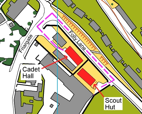 We also have use of the nearby Army Cadet Hall. To get between the two buildings you need to go round the road (pink line on map below)