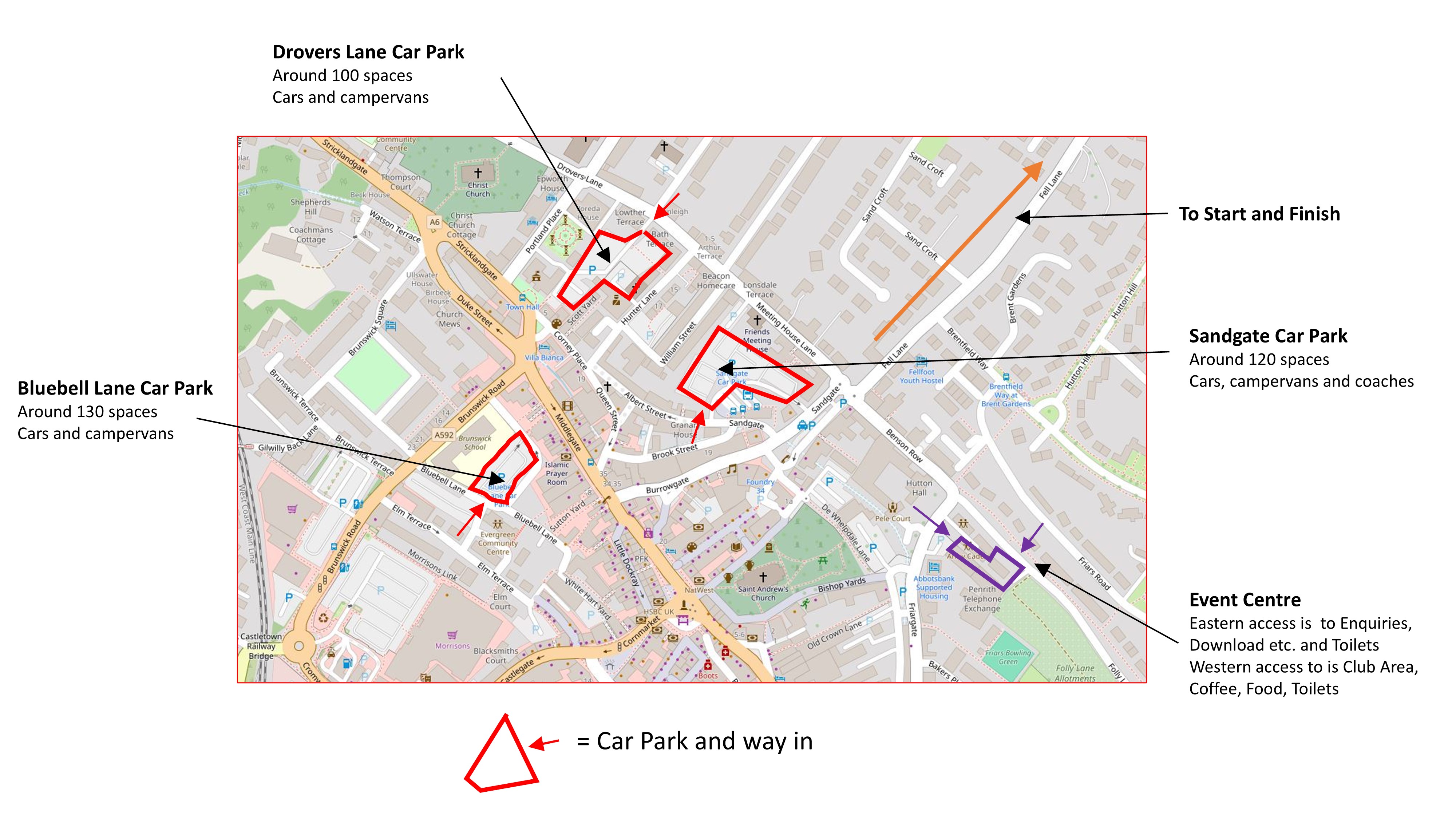 There is no event car park. Competitors should park either in one the public car parks in Penrith or find suitable street parking. A map showing the three most suitable car parks is here. All the car parks charge £1.30 for the full day on Sundays. Payment is by coins or the PayByPhone app.