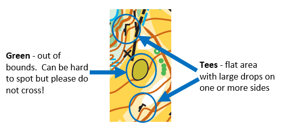 There are a number of tees which are built up with stone walls on one or more sides. Please plan your route to avoid running over tees and then you won’t have to worry about this. However note that there is one tee in particular with a drop of around 2m off one side; which Green and Blue may pass early on their courses. This will be marked with tape.