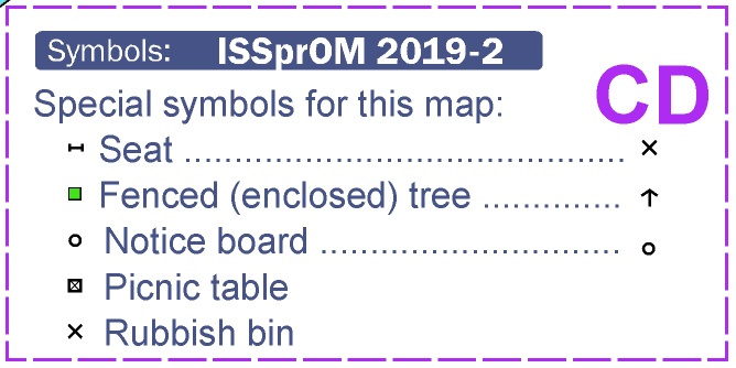 Map: 1:4000, 2m contours, updated autumn 2024. A4 size, printed on waterproof paper, control descriptions on front. No loose control descriptions. The map is to ISSproM 2019-2 standard with open-field yellow reduced in brightness. Note there are symbols used on the map and in control descriptions for seats (x) and fenced young trees (fodder rack). These are shown here and are also printed on the face of the map.
